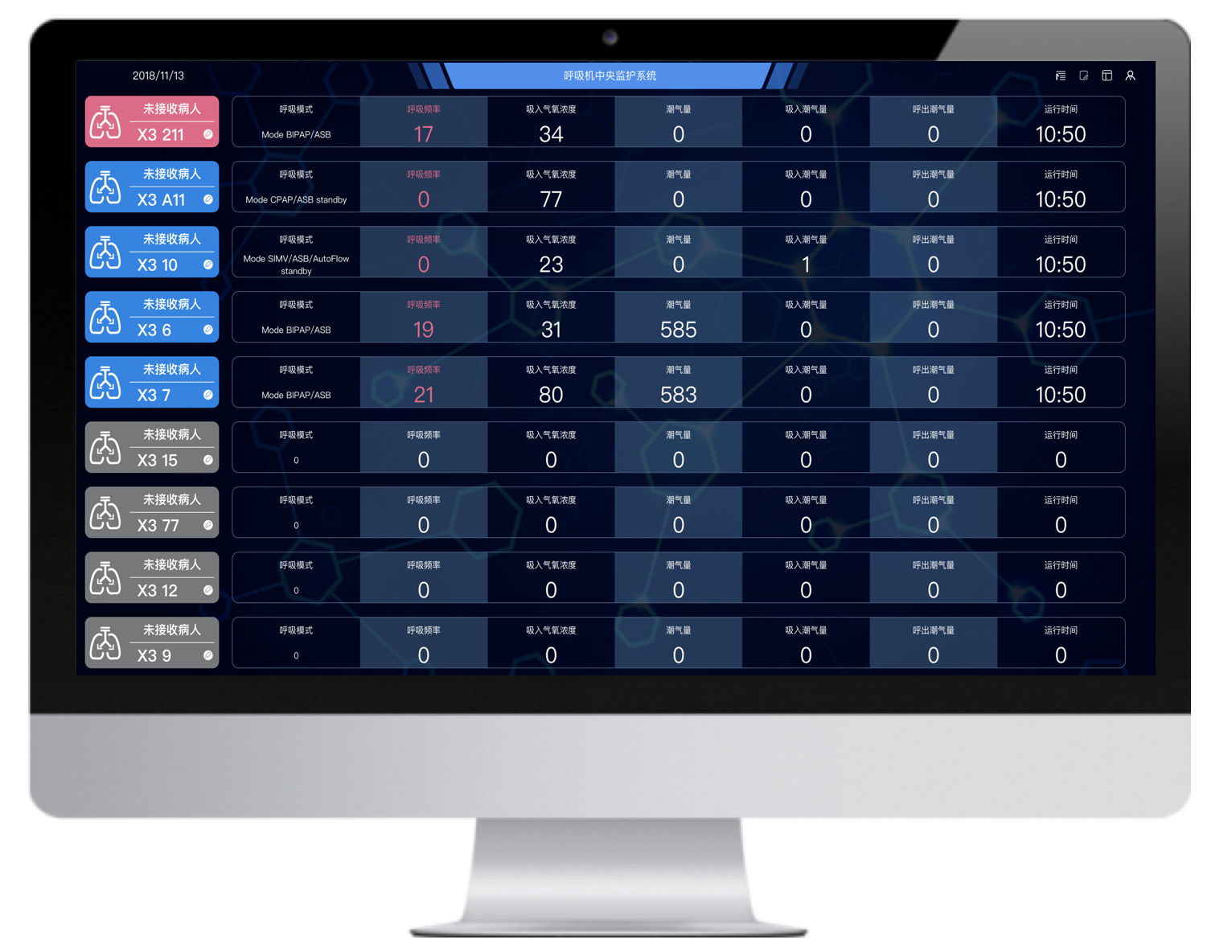 通過的最新的數(shù)據(jù)采集技術(shù)和網(wǎng)絡(luò)技術(shù)將多臺(tái)不同品牌的有創(chuàng)呼吸機(jī)聯(lián)網(wǎng),并通過大屏實(shí)時(shí)集中呈現(xiàn)治療預(yù)設(shè)參數(shù)和監(jiān)測(cè)參數(shù),實(shí)現(xiàn)多臺(tái)集中監(jiān)測(cè)、集中管理和數(shù)據(jù)存儲(chǔ)。
